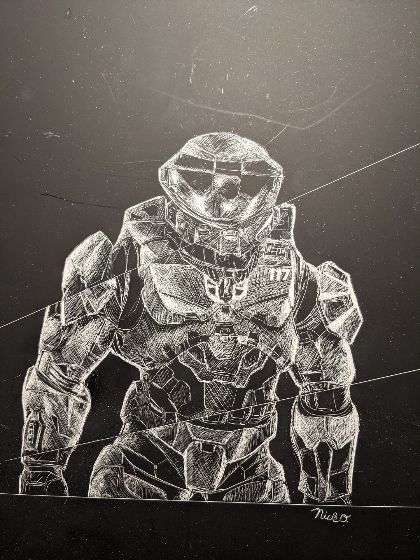 “I had a random idea to make a mashup of the first and most recent iterations of Chief. I decided to do it on a spare scratchboard! This took over 10 hours. I love this evolution.”